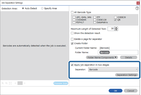 2Selecione Aplicar separação de trab, defina Separador para Código de Barras, e então clique em Config de Separação.
