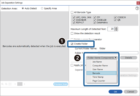 4Marque Criar Pasta, selecione Código de barras de Componentes do nome da pasta.