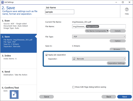 2Selecione Aplicar separação de trab, defina Separador para Código de Barras, e então clique em Config de Separação.
