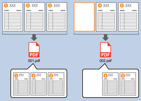 Colocando folhas de papel em branco entre as páginas do documento sendo digitalizado, você pode dividir os dados digitalizados e salvá-los em arquivos ou pastas separados. Ao digitalizar os dois lados de um documento, se um dos lados estiver em branco, ele também é detectado como uma página em branco. Depois de ordenar, você pode remover quaisquer páginas desnecessárias e salvar.