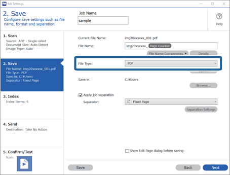 1Exiba a tela Configurações do Trabalho e então clique na aba 2. Salvar.
