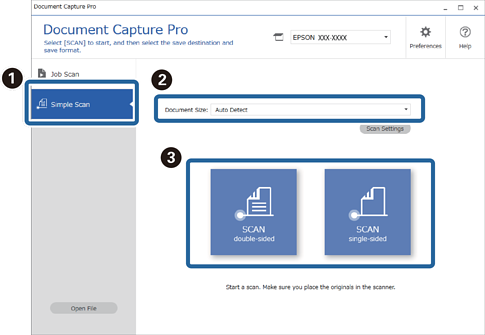 1Wählen Sie am oberen Bildschirmrand von Document Capture Pro den Scanner aus, den Sie verwenden möchten. Wenn Sie die Software starten, verbindet sie sich automatisch mit dem zuletzt verwendeten Scanner.