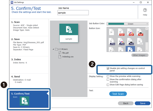 3. 3Klicken Sie auf die Registerkarte 5. Bestätigen/Testen, und wählen Sie dann auf dem Bedienfeld Auftragseinstellungsänderungen an Bedienfeld deaktivieren.