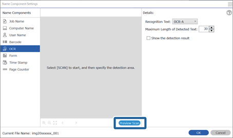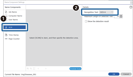 Konfigurieren Sie zur Auswahl von Optische Zeichenerkennung in Dateinamenskomponenten die Einstellung unter Details und wählen Sie dann die Option aus.