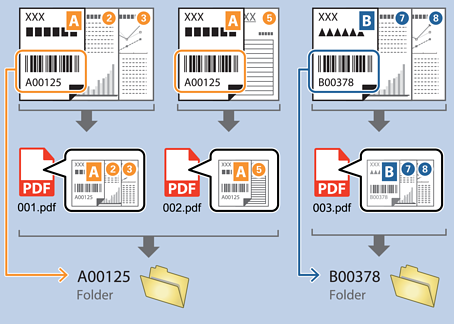 Anhand der Strichcode-Zeichen lassen sich Dateien nach jeder Seite trennen, auf der ein Strichcode erkannt wird, und es lassen sich anhand der Textangaben im Strichcode Ordner erstellen und speichern.