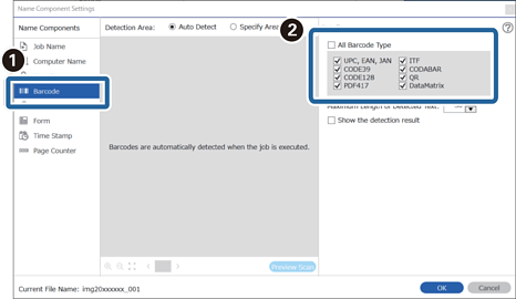 6Wählen Sie Strichcode in Dateinamenskomponenten aus.