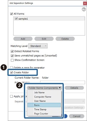 In diesem Abschnitt werden die Auftragseinstellungen für „Trennen nach Formular und Speichern mit dem Formulartyp als Ordnername“ erläutert.
