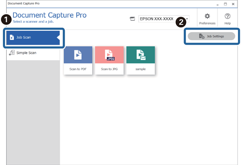 1Klicken Sie auf die Registerkarte Auftragsscan im oberen Bereich des Bildschirms von Document Capture Pro, und klicken Sie dann auf Auftragseinstellungen.