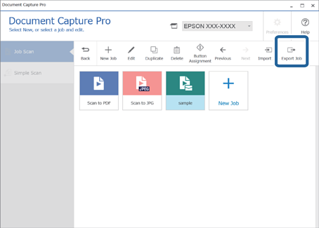 Wenn Sie einen Auftrag exportieren, wird er auf Ihrem Computer als Auftragsdatei (.jxz) gespeichert. Sie können die gespeicherte Datei auf einem anderen Computer verwenden, indem Sie sie mit Document Capture Pro importieren.