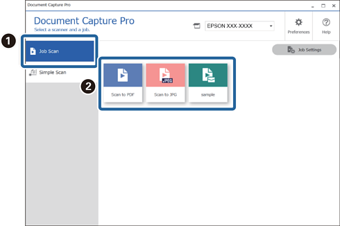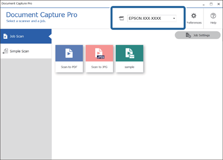 1Wählen Sie am oberen Bildschirmrand von Document Capture Pro den Scanner aus, den Sie verwenden möchten. Wenn Sie die Software starten, verbindet sie sich automatisch mit dem zuletzt verwendeten Scanner.