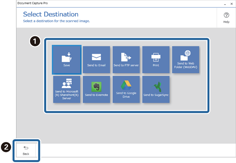Sélectionnez la destination. Cliquez sur l’icône de destination pour afficher l’écran de paramètres détaillés pour la destination. Sélectionnez la destination dans les éléments suivants. Dossier de sauvegarde, envoyer e-mail, serveur FTP, dossier Web, serveur Microsoft (R) SharePoint (R), Evernote, Google Drive, SugarSync |