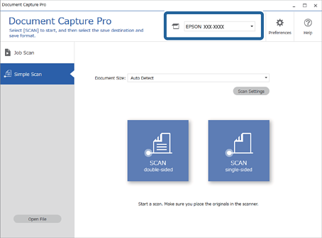 1Sélectionnez le scanner que vous souhaitez utiliser dans l’écran supérieur Document Capture Pro. Lorsque vous démarrez le logiciel, il se connecte automatiquement au dernier scanner utilisé.