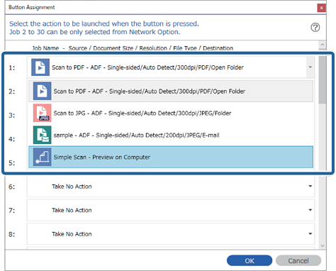 Lorsque vous utilisez le panneau d’interface réseau (ou unité), vous pouvez assigner jusqu’à 30 travaux aux boutons. Si vous utilisez un scanner qui ne dispose pas d’un panneau de commande qui utilise une connexion USB, assignez le travail au bouton 1.