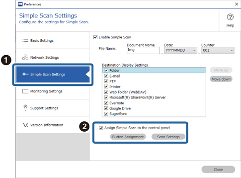 3Depuis le menu déroulant, sélectionnez les Paramètres de scannage simples que vous souhaitez effectuer depuis le panneau de commande du scanner (boutons).