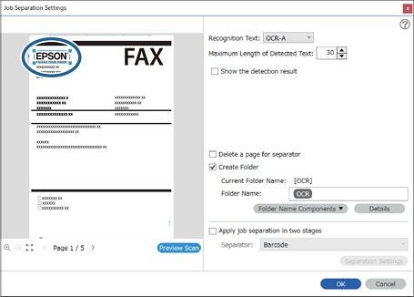 3Sur l’écran Paramètres de séparation de travaux, sélectionnez la langue du texte qui est lu depuis Reconnaissance de texte . Sélectionnez Créer un dossier, puis sélectionnez OCR dans Composants du nom de dossier.
