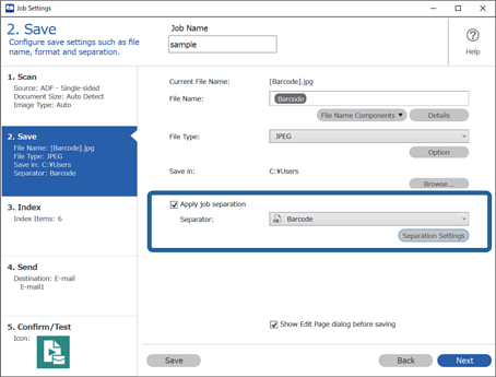Si vous ne souhaitez pas utiliser de code-barres ou d’OCR pour séparer les travaux, cliquez sur l’onglet 2. Enregistrer.
