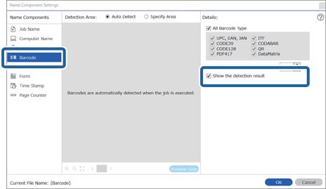 5Sur l’écran Paramètres du composant du nom, sélectionnez Afficher les résultats de détection pour reconnaître les code-barres ou OCR, puis cliquez sur OK.