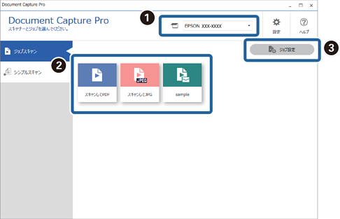 次の一連の動作を登録したものを「ジョブ」と呼びます:[1. スキャン]-[2. 保存]-[3. インデックス]-[4. 転送]-[5. 設定確認/テスト] 登録されているジョブのアイコンをクリックするだけで、一連の動作を実行できます。 |