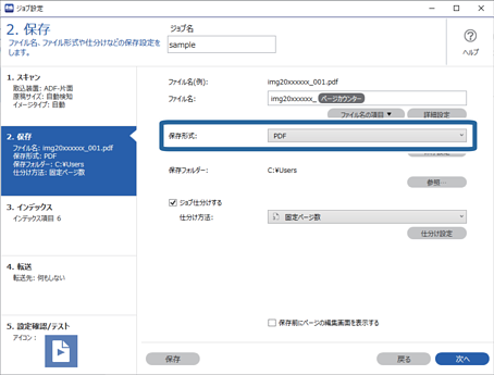 1[ジョブ設定]画面を表示し、[2. 保存] タブをクリックします。