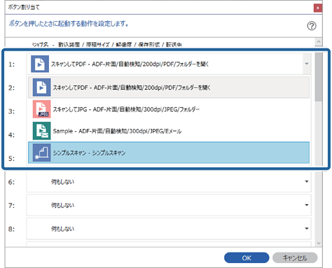 ネットワークインターフェイスパネル(またはユニット)を使用した場合は、30までのボタンにジョブを割り当てられます。操作パネルがないスキャナーをUSB接続で使用した場合は、ボタン1に割り当ててください。
