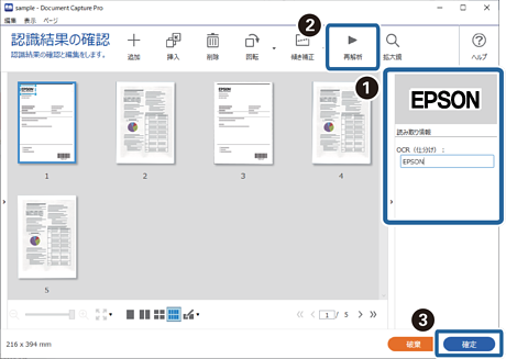 文字が正しく読み取れたか確認したい場合は、[認識結果を確認する]にチェックを入れてください。スキャン後に表示される画面で、認識された領域や文字が確認できます。また、領域を指定し直して再認識させたり、文字を訂正したりすることもできます。