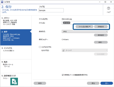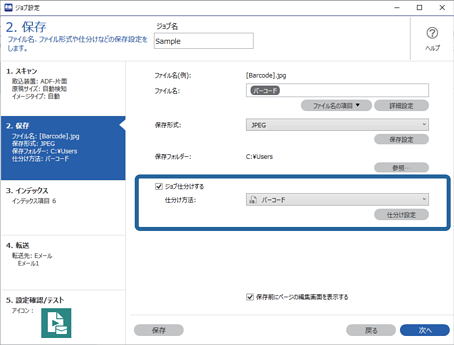 ジョブ仕分けにバーコードやOCRを使用する場合は、続けて[2. 保存]タブで設定します。