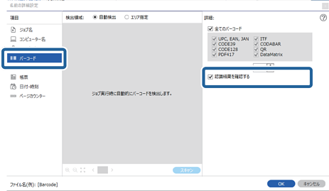 5[名前の詳細設定]画面で、バーコードやOCRを認識し、[認識結果を確認する]にチェックを入れて、[OK]をクリックします。
