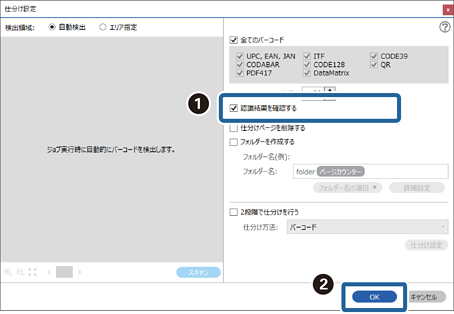 7[仕分け設定]画面で[認識結果を確認する]にチェックを入れて、[OK]をクリックします。