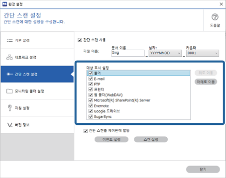 2간단 스캔 설정를 클릭한 후 대상 표시 설정에서 표시하지 않으려는 대상은 제거합니다.