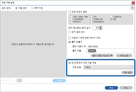 2작업 구분 적용을 선택하고 구분 방법를 바코드로 설정한 후에 구분 설정를 클릭합니다.