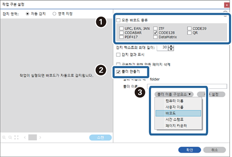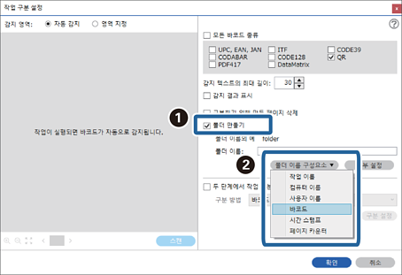 6추가적으로 작업 구분 설정 화면에서 두번째 폴더에 사용하려는 바코드 유형을 선택하고 폴더 만들기를 선택한 후에 바코드(폴더 이름 구성요소에서)를 선택한 후에 폴더 이름에 추가합니다.