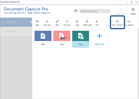 작업 가져오기를 실행할 때 다른 컴퓨터에서 생성하고 Document Capture Pro를 사용해서 내보내기한 작업 파일(.jxz)을 이용할 수 있습니다.