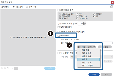이 섹션에서는 “바코드별로 파일을 저장하고 바코드 내 텍스트 정보를 이용한 폴더 이름으로 저장하기”에 대한 작업 설정을 설명합니다.