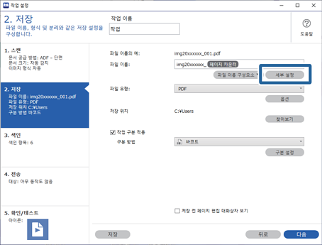 1작업 설정 화면을 표시하고 2. 저장 탭을 클릭합니다.