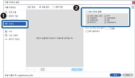 바코드(파일 이름 구성요소에서)을 선택하기 위해 세부 설정에서 설정을 지정한 다음 선택합니다.