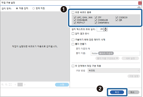 3작업 구분 설정 화면에서 사용하려고 하는 바코드 유형을 선택합니다(문서에 배치). 확인를 클릭해서 작업 설정 화면으로 돌아갑니다.
