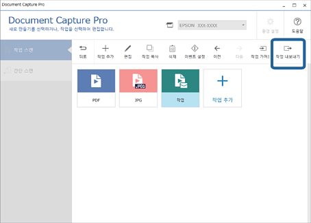 작업 내보내기를 실행하면 컴퓨터에 작업 파일(.jxz)로 저장됩니다. Document Capture Pro를 이용해서 가져오기를 수행함으로써 다른 컴퓨터에 있는 저장된 파일을 이용할 수도 있습니다.