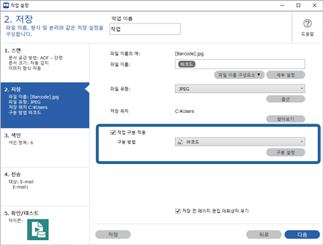 6작업 구분 적용을 클릭한 후 바코드 또는 OCR(구분 방법에서)을 선택하고 구분 설정를 클릭합니다.