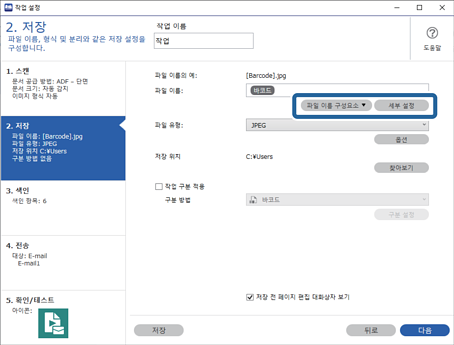 4파일 이름에 바코드나 OCR을 추가하려면 바코드 또는 OCR(파일 이름 구성요소에서)을 선택한 후 세부 설정를 클릭합니다.