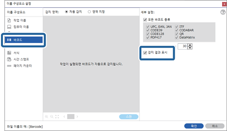 5이름 구성요소 설정 화면에서 감지 결과 표시를 선택해서 바코드나 OCR을 인식하고 확인를 클릭합니다.