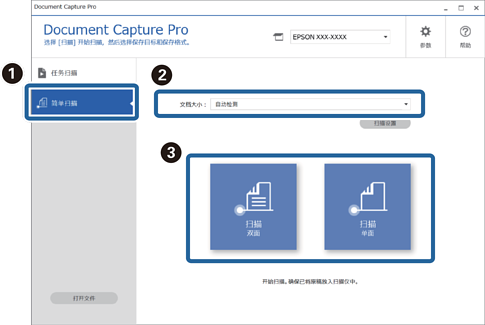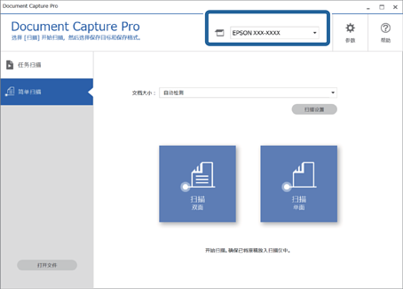 1从 Document Capture Pro 顶层屏幕选择您要使用的扫描仪。当您启动软件后,它会自动连接至您上次使用的扫描仪。
