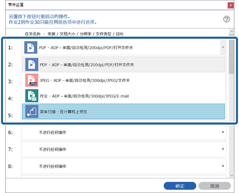 如果您使用网络界面面板(或单元),您可分配最多 30 个任务至按键。如果您通过 USB 连线使用没有操作面板的扫描仪,分配任务至按键 1。