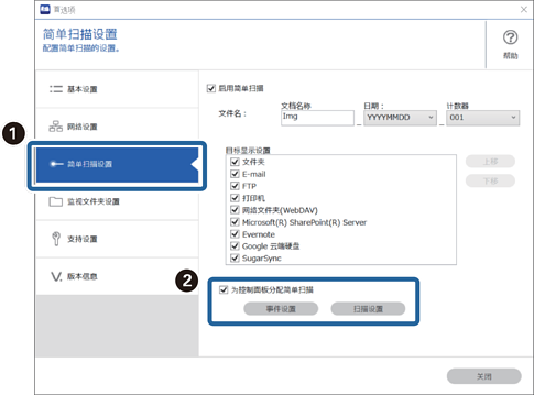2单击 简单扫描设置 选项卡,选择 为控制面板分配简单扫描,然后单击 事件设置。