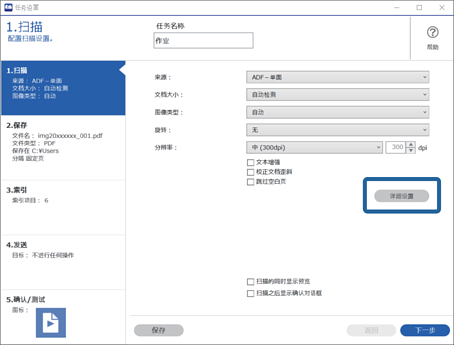 单击 任务设置 屏幕上的 1.扫描 选项卡,然后单击 详细设置。