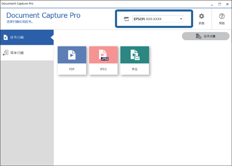 1从 Document Capture Pro 顶层屏幕选择您要使用的扫描仪。当您启动软件后,它会自动连接至您上次使用的扫描仪。