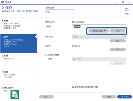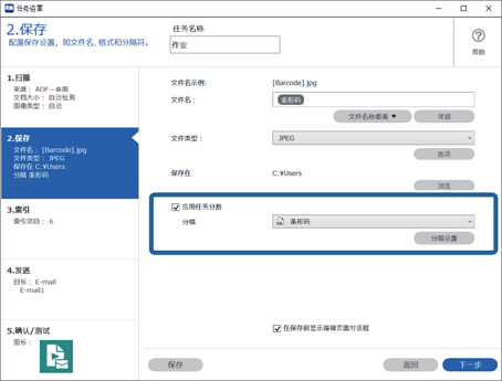 如果您要使用条形码或 OCR 分隔任务,单击 2.保存 选项卡。