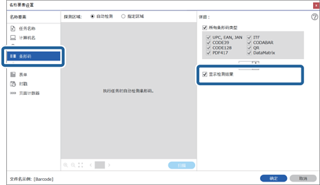 5在 名称要素设置 屏幕上,选择 显示检测结果 以识别条形码或 OCR,然后单击 确定。