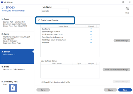 Dieser Abschnitt erläutert die Auftragseinstellungen für „Neuen benutzerdefinierten Index erstellen und als Indexdatei ausgeben“.