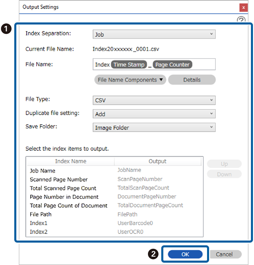 9Legen Sie die Ausgabeelemente und den Dateinamen fest, die Sie für die Ausgabe der Indexelemente in eine Datei verwenden möchten, und klicken Sie dann auf OK.