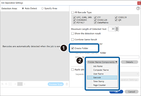 In diesem Abschnitt werden die Auftragseinstellungen für „Auftrennen nach Barcode und Speichern der Barcode-Textdaten als Ordnername“ erläutert.